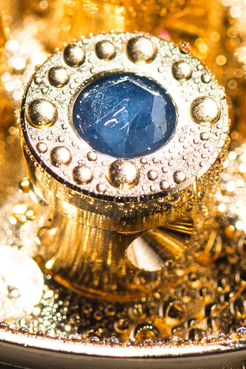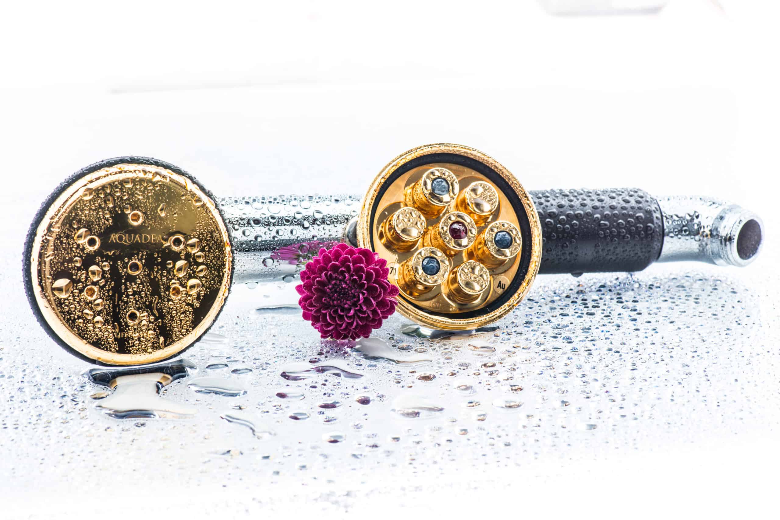 Precision crafted showerhead combining noble metals, exquisitely cut crystals and precious gems immersed in Crystal Vortex Implosion Chambers using Aquadea Light Crystal Technology.