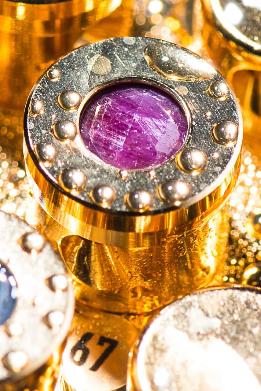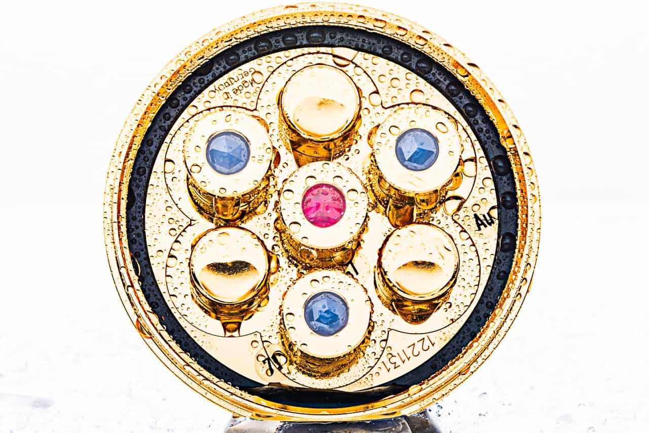 The choice of 5, 6 or 7 vortex chambers are then encased on top. These can be encased in the same base root tone metal as the base itself, or be different to the base root tone metal and combined with a crystal (in various cuts) as the overtones.