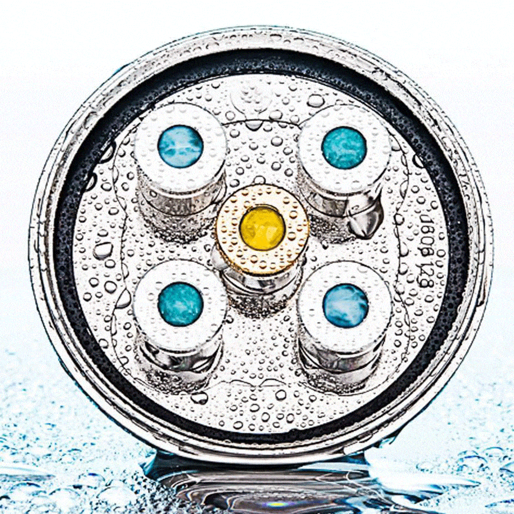 The Larimar 5 is an exquisite combination of Sapphire, Larimar, Amazonite & Platinum. The central power of the yellow Sapphire, awakens the “knower” within us all and brings a resonant feeling of inner joy and that “everything is in perfect order”. For encountering new life force, focused intuition and self-realisation. Transforming your entire shower experience.