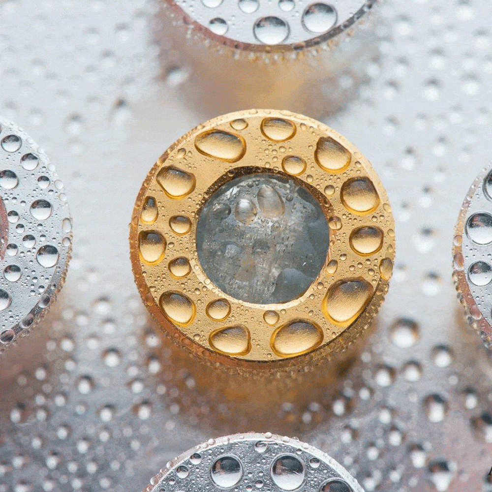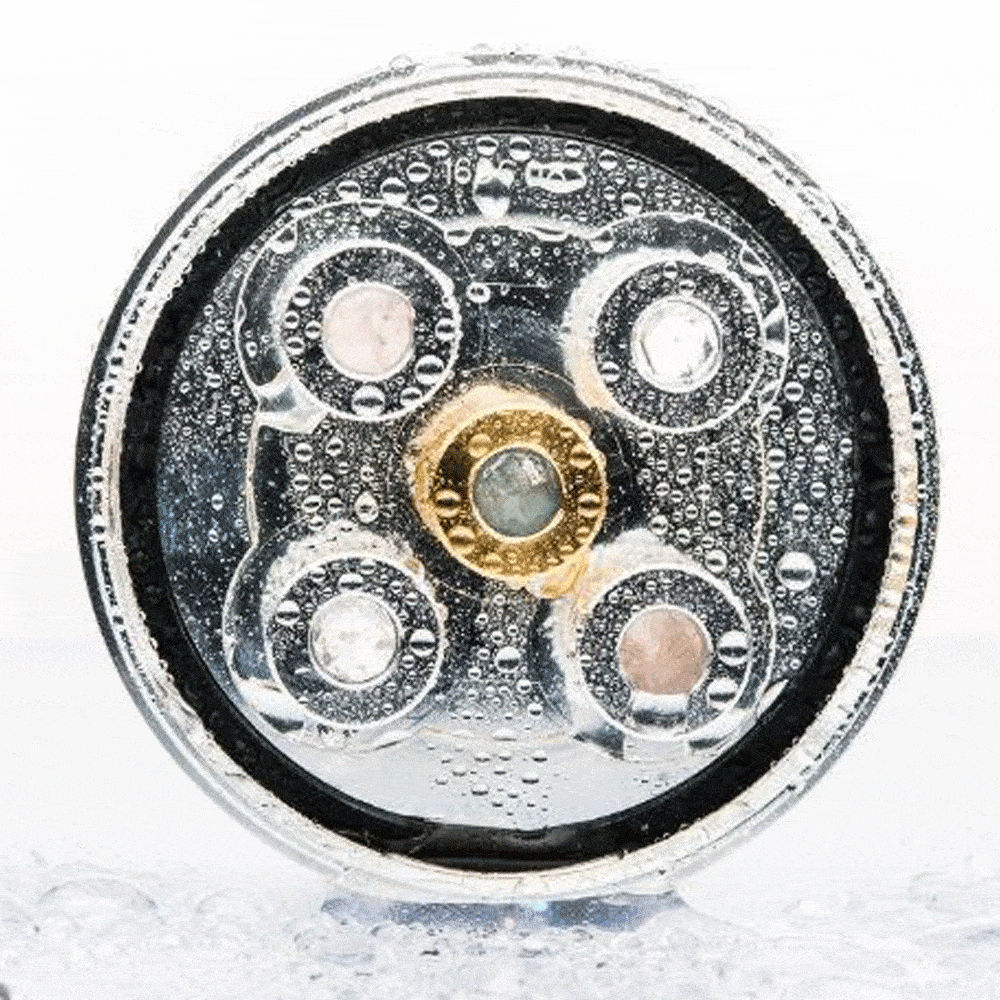 When the water impacts the crystal the force from the subsequent vortex-chamber elicits the crystal structure unique vibrations bringing forth its own very special overtone. The pureness and precision of the crystal vortex-chambers are complimented with the root tone of the Showerhead base noble metal allowing for a unique sonic composition and soundscape to be created and experienced.
