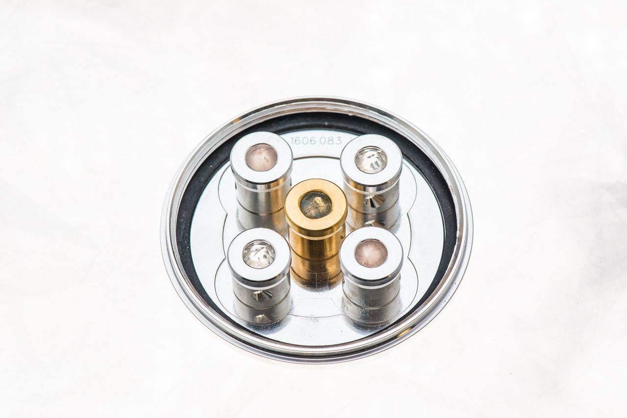 The choice of 5, 6 or 7 vortex chambers are then encased on top. These can be encased in the same base root tone metal as the base itself, or be different to the base root tone metal and combined with a crystal (in various cuts) as the overtones.